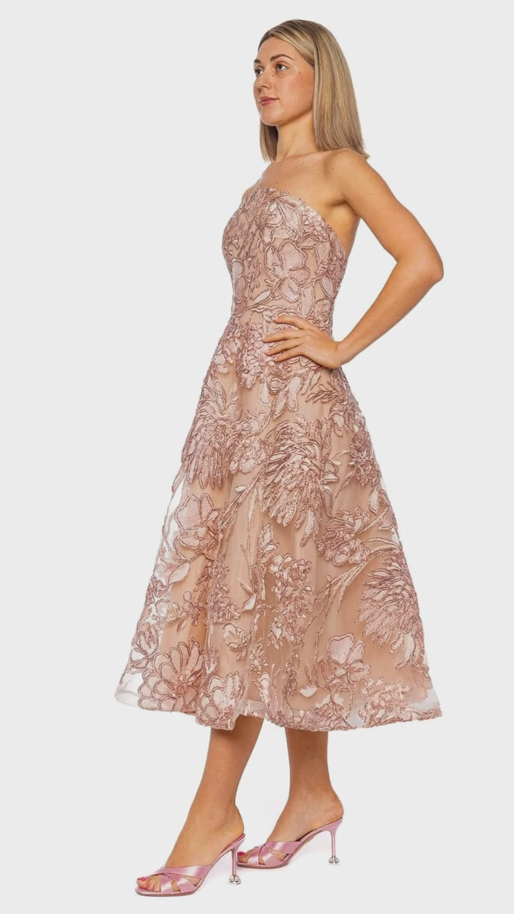Pink Raffia Floral Strapless Midi Dress