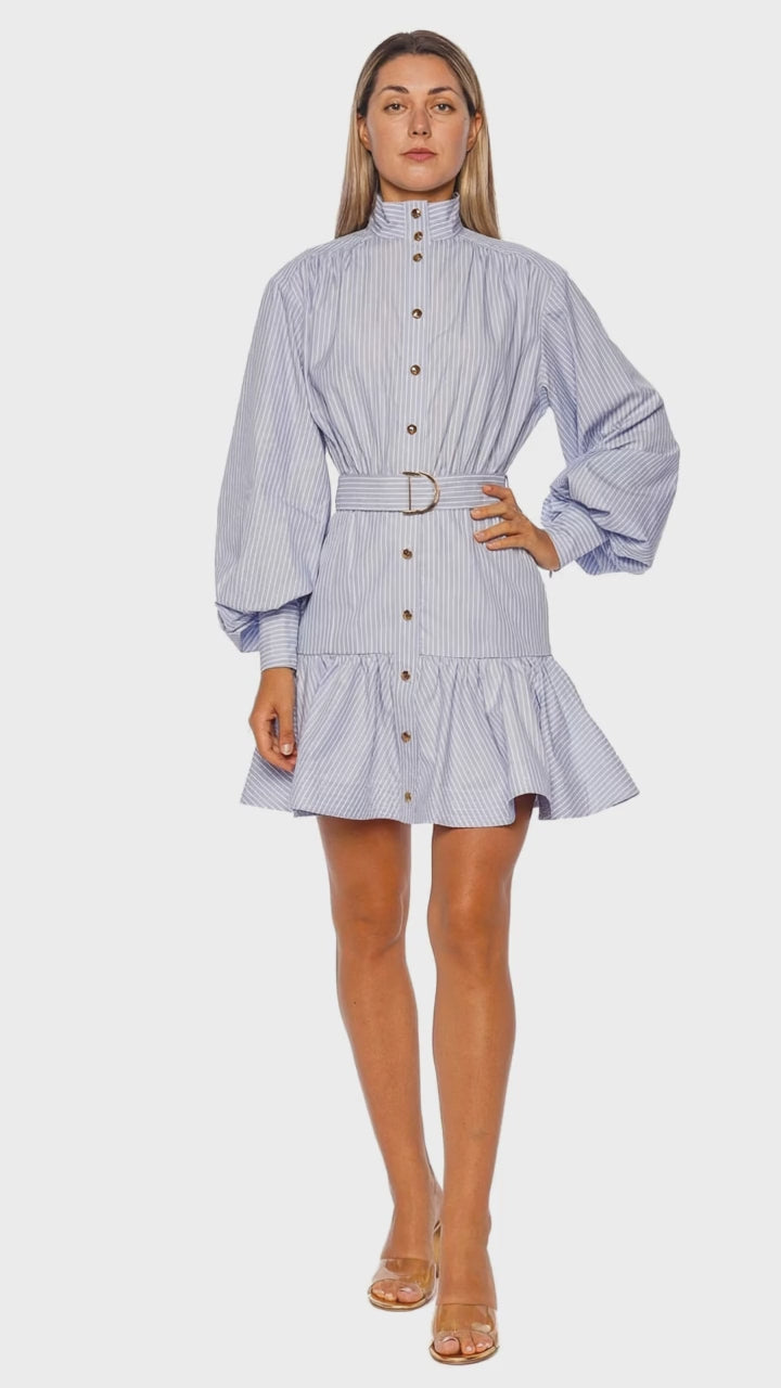 Embrace modern elegance with this stripe utility mini dress, impeccably designed with a belted waist to accentuate your silhouette. The delicate blue striped pattern adds a touch of classic sophistication, while the voluminous long sleeves create a dramatic yet refined look. Ideal for both casual brunches and chic evening soirees, this dress embodies both style and versatility in one luxurious package.