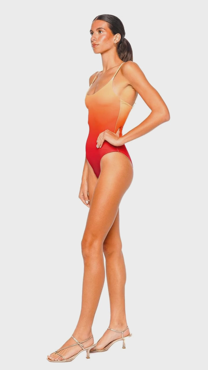 Embrace the allure of sunset hues with this exquisite ombre one-piece swimsuit. Crafted from luxuriously smooth material, this piece features thin straps and an effortlessly flattering silhouette. Perfect for poolside lounging and beachside adventures, it captures the essence of serene sophistication. Pair it with oversized sunglasses and a wide-brim hat for an ultimate resort-ready ensemble.