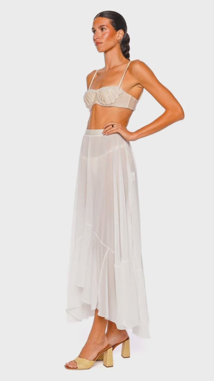 This sophisticated maxi skirt indulges in sheer elegance with its flowing silhouette, exuding a sense of ethereal beauty. The off-white hue and high-low hem create a stunning visual effect, making it perfect for beachside soirées or upscale garden parties. Pair it with a delicate bralette or a fitted crop top to complete an effortlessly chic ensemble.