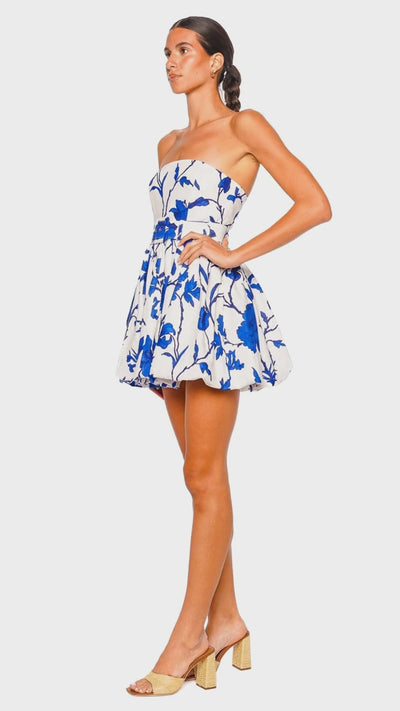 Elegantly crafted from luxurious fabric, the Athena Cobalt Strapless Mini Dress is a vision of modern sophistication. The bold cobalt floral pattern against a crisp white background creates a striking visual, perfect for making a statement at any occasion. This dress features a flattering structured bodice and a cinched waist with a matching belt, emphasizing a feminine silhouette.