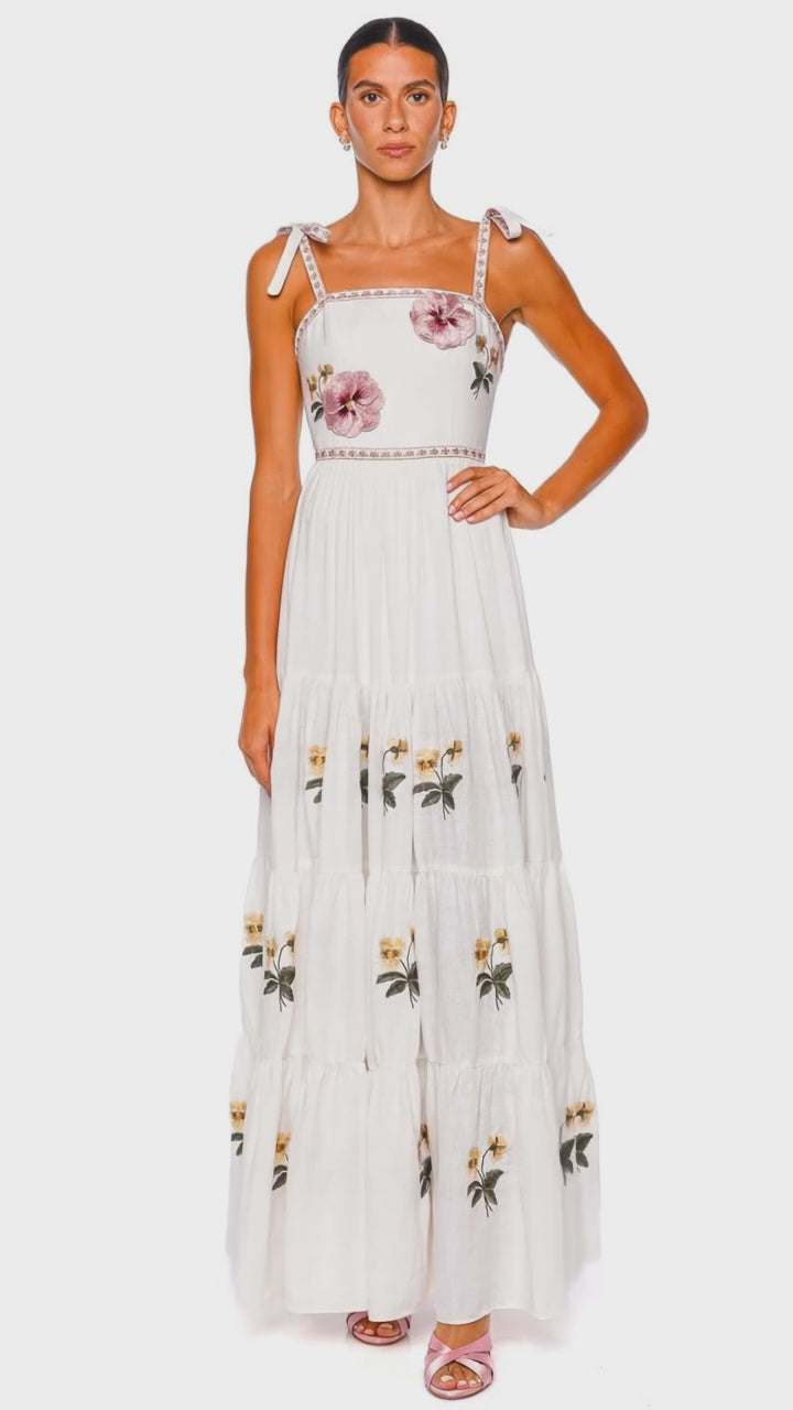 Embrace a serene elegance with the Tara Embroidered Maxi Dress, crafted from high-quality fabrics for an ultra-sophisticated look. This ethereal dress features delicate floral embroidery in harmonious pink and yellow hues, beautifully detailed across the tiered skirt. The charming tie straps add a touch of playfulness, while the flowing silhouette embodies effortless grace. Perfect for warm weather soirées, pair it with minimalist accessories and sandals for an enchanting ensemble.