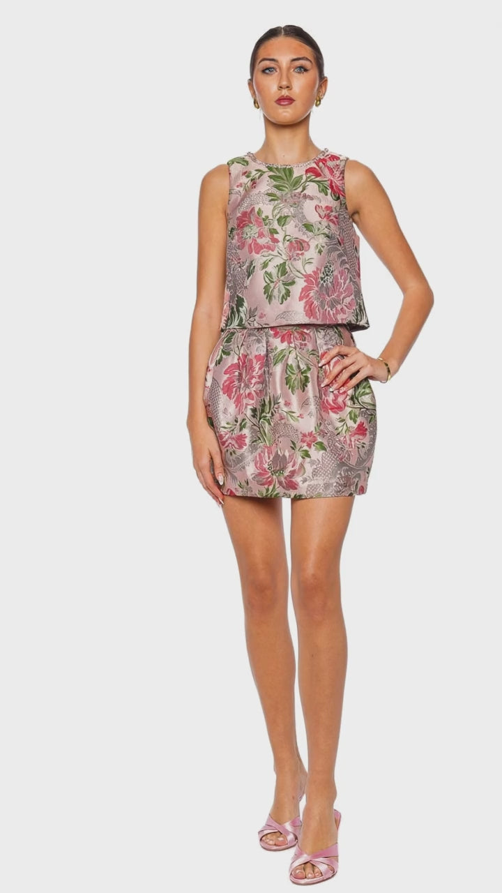 This stunning bubble hem mini skirt captures attention with its luxurious metallic jacquard fabric, exuding elegance and sophistication. The detailed floral pattern is perfectly paired with a belted waistband, offering a chic and polished look that commands attention. Style it with strappy heels and a sleek clutch for an unforgettable fashion statement.
