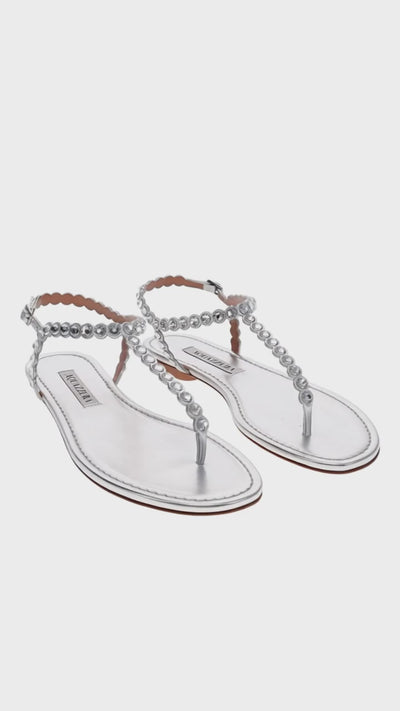 Made in Italy from metallic silver leather and scattered with shimmering crystals, these flat sandals feature a minimal T-strap profile.
