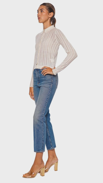 A straight leg jean with a cropped silhouette and a clean hem. Finished with subtle fading and light whiskering for a lived-in feel.