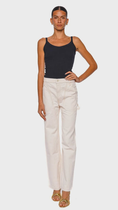Discover effortless sophistication with these wide leg pants, crafted in an elegant ivory hue for a refined, modern silhouette. The premium cotton blend fabric offers both comfort and structure, while distinctive seam detailing and utilitarian-inspired pockets add a subtle edge. Perfect for elevating your everyday wardrobe, these pants transition seamlessly from day to night. Pair them with a sleek fitted top and strappy heels for a chic, polished ensemble.