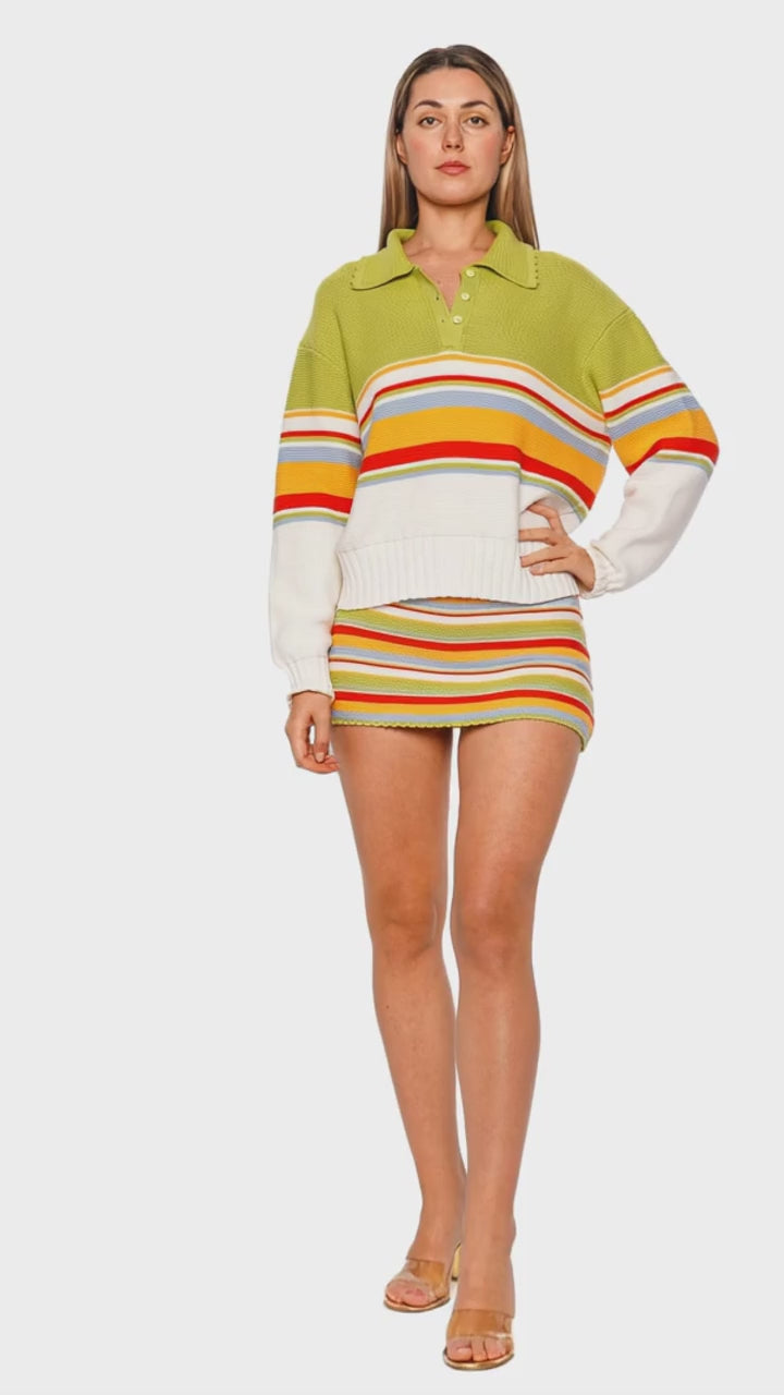 Embrace vibrant sophistication with the Cleo St. Barths Stripe Collared Pullover, a stunning piece that effortlessly combines color and comfort. Crafted from premium cotton fabric, this pullover features playful multicolor stripes set against a chic olive base, making it an ideal statement piece for any wardrobe. The relaxed silhouette and broad ribbed hem provide a refined touch, perfect for elevating both casual and semi-formal ensembles. Pair with the matching skirt and strappy heels for a dynamic, coordinated look.