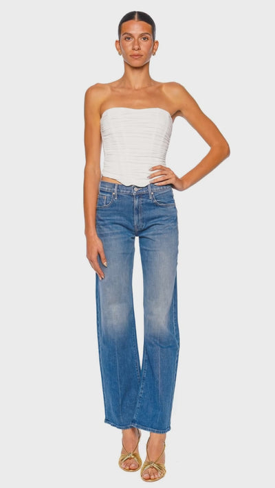 Elevate your denim collection with these mid rise lasso jeans, crafted in a timeless blue wash with a modern wide leg silhouette. The premium cotton denim ensures a comfortable yet structured fit, perfect for both casual and elevated styling. Subtle fading and raw edge hems add a touch of contemporary flair, making these jeans a versatile staple for any wardrobe. Pair them with a chic blouse and strappy heels for an effortlessly sophisticated look.
