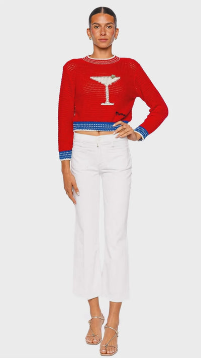 This statement-making cropped pullover brings playful luxury to knitwear with its vivid red open-knit construction and striking martini glass motif at the front. Designed with long sleeves, a classic crew neckline, and contrasting blue and ivory trim, it delivers a bold yet polished finish. The artisanal texture and novelty detailing make it a standout piece for elevated resort styling or chic off-duty dressing. Wear it with crisp white denim, tailored shorts, or sleek trousers and strappy heels for a fashion-forward ensemble.