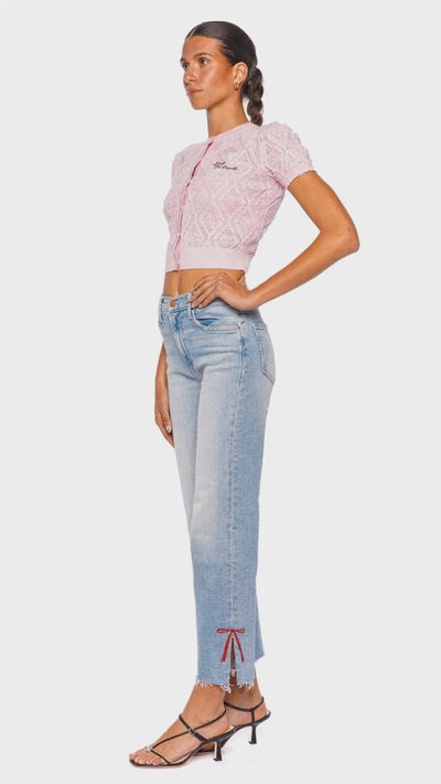 Elevate your denim collection with these light wash straight leg jeans, crafted for the discerning woman who values both modern style and comfort. Featuring distinctive frayed hems and playful red ribbon details at the ankle slits, this pair brings a fresh, trend-forward twist to classic denim. The high-quality fabric ensures a flattering fit and all-day ease, perfect for both casual outings and chic city strolls. Pair these jeans with a fitted knit top and strappy heels for a look that exudes effortless sophistication.