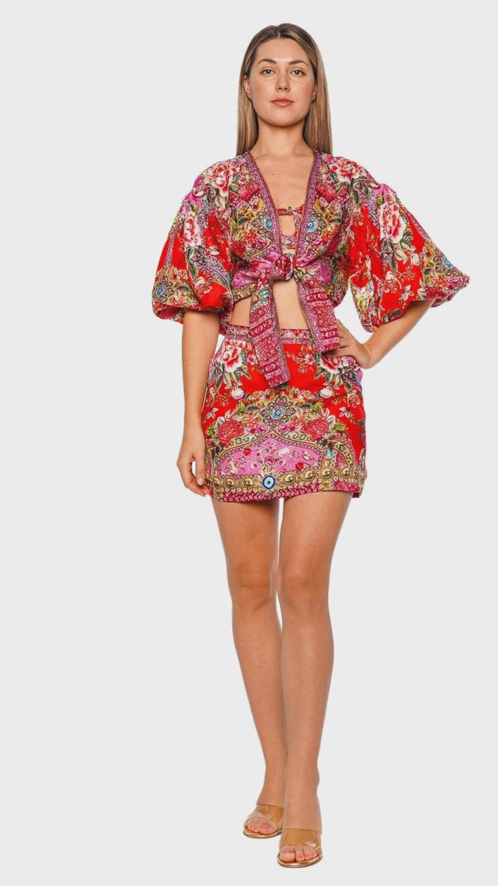 Embrace the timeless elegance of this vibrant top, adorned with a lush floral pattern set on a radiant red backdrop. The voluminous puff sleeves and tie-front detail create an effortlessly chic silhouette that captures attention with every movement. Exquisitely crafted, this piece promises to be a stand-out addition to your wardrobe. Pair it with a matching skirt and sleek heels for an elevated ensemble that transitions seamlessly from day to night.