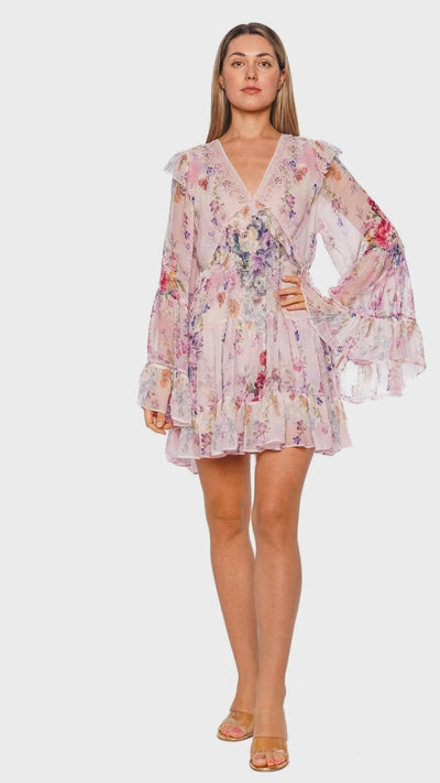 Enchanting and ethereal, this floral mini dress features an elegant tiered design that flows with whimsical charm. Crafted from luxurious, lightweight fabric, its romantic floral pattern evokes a sense of playful sophistication. This statement piece, defined by its swing silhouette and airy long sleeves, promises graceful movement and an aura of refined delicacy. Perfect for a garden soirée, style it with delicate jewelry and strappy sandals for a harmonious ensemble.