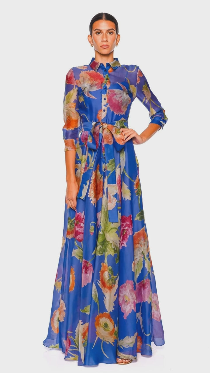 Embrace the essence of elegance with this Bluebell Multi Floral Trench Gown, crafted from luxurious lightweight crepe organza fabric. The vibrant floral print and trench-style silhouette make this gown a standout piece for sophisticated gatherings. Its flowing form and tie-waist accentuate your figure, offering a blend of timeless style and modern charm. Perfect for garden parties or evening occasions, this gown exudes an air of refined grace.