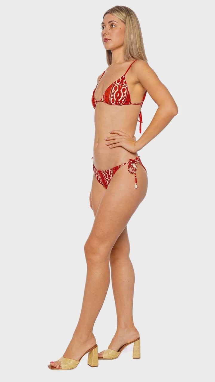 Indulge in the captivating allure of this Tribal Konibo Triangle Bikini Top, skillfully crafted to enhance your beach repertoire. Its bold red and ecru tribal pattern brings a sense of exotic elegance, while the triangle silhouette offers a flattering fit. Designed for sun-soaked days, it features delicate straps that exude a blend of femininity and confidence. Pair it with matching bikini bottoms or sleek sunglasses for an unforgettable seaside look.