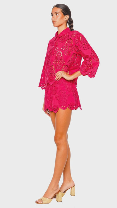 Step into summer with the vibrant allure of the Trish Azalea Eyelet Shorts. Meticulously crafted in a bold azalea hue, these shorts feature intricate eyelet detailing that adds a playful yet sophisticated touch to your ensemble. The lightweight fabric offers breathability and comfort, perfect for warm-weather escapades. Pair them with a crisp white blouse and sandals for a chic daytime look or elevate the outfit with a tailored blazer and heels for evening sophistication.
