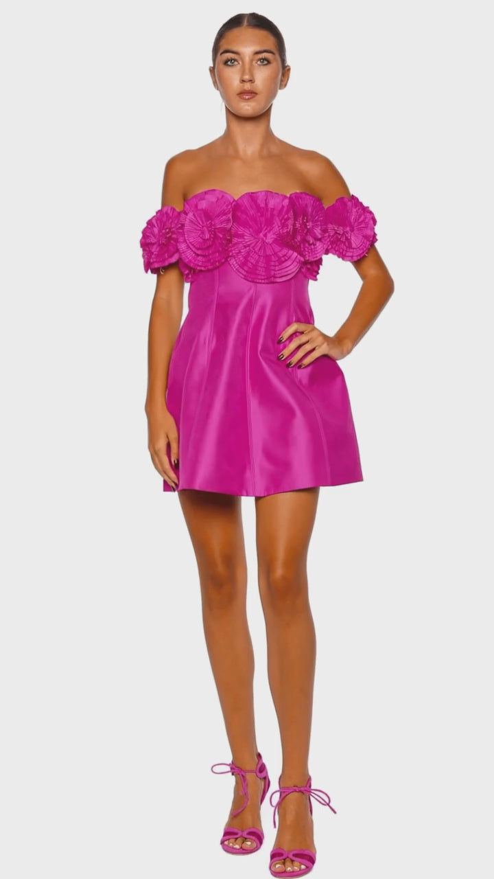 This satin mini dress features an off shoulder neckline enhanced with sculptural rosette details.