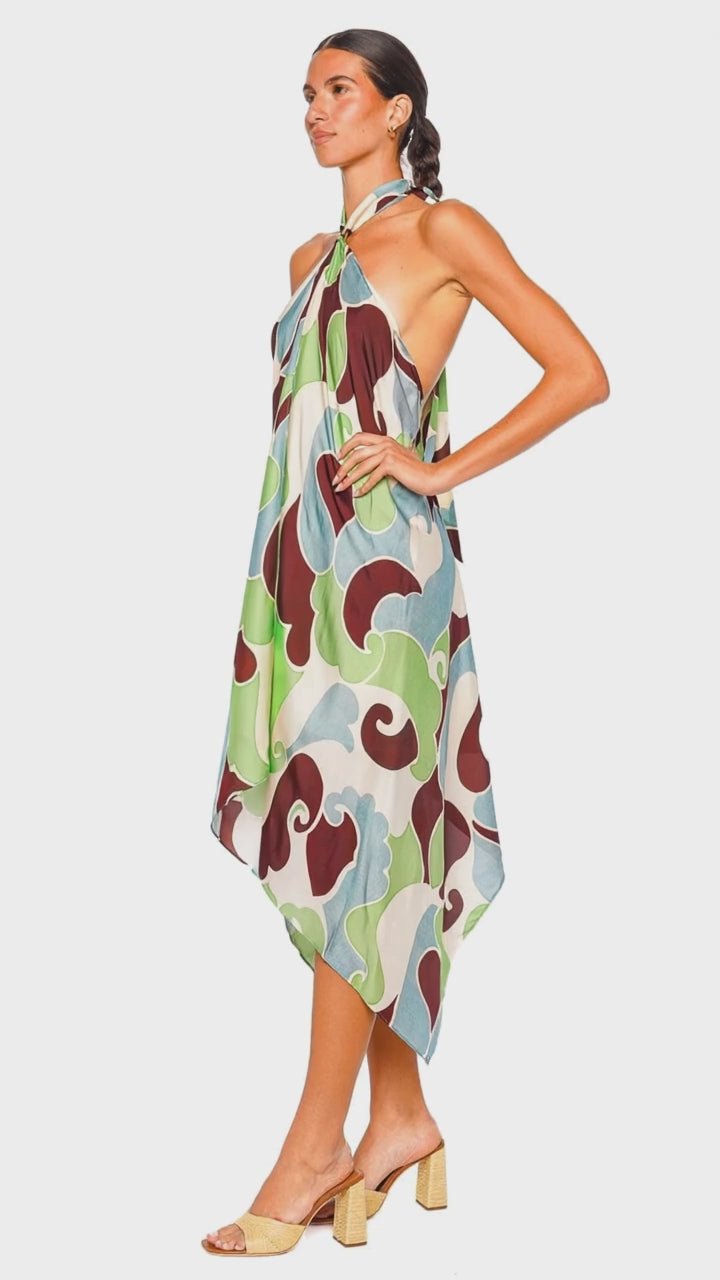 Embrace the fluid elegance of this petal wave mint halter twist midi dress, designed to captivate with its artistic swirling print and airy fabric. The halter neckline forms a flattering twist that enhances the silhouette, making it ideal for sun-soaked gatherings or an enchanting evening out. This unique piece delivers on both style and comfort, ensuring you turn heads effortlessly. Pair it with understated accessories for a look that embodies sophistication and modern flair.