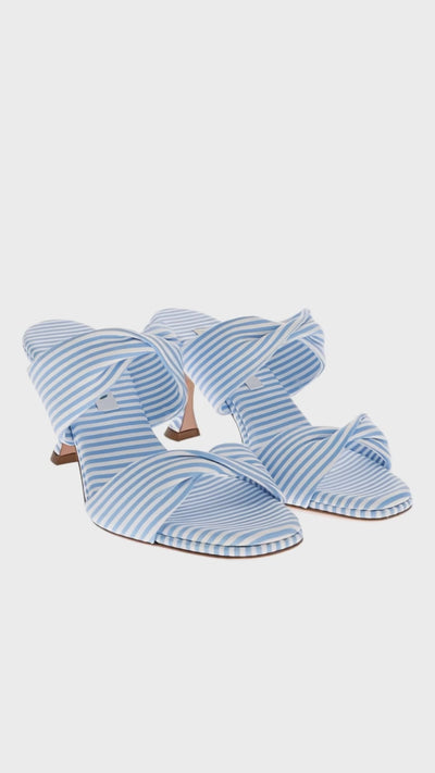The Twist Sandal is a backless sandal featuring artful knot detailing and a curved 75mm heel. Crafted from butter-soft Nappa with hidden padding and a double padded insoles, this striped blue sandal adds a chic touch to summertime ensembles.