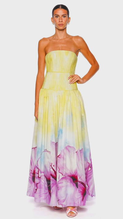 Vacation Ombre Hibiscus Pleated Strapless Gown