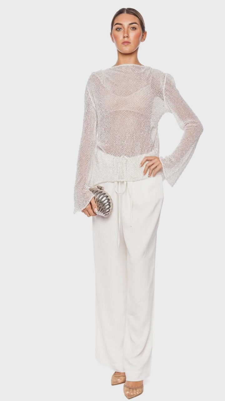 This long sleeve open knit top features tonal sequin embellishments throughout for a unique touch. Sheer design and an oversized fit, undergarments not included.