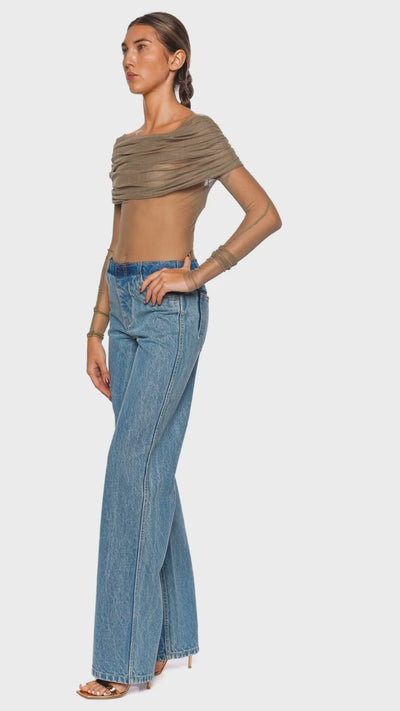 The Veiled Top is worn off the shoulder and features a sheath of soft stretch silk tulle across the bust, offering transparency across the body.