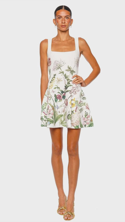 The Velma Mini Dress in Bloomsfield Ivory captures effortless polish with a sculpted, square-neck bodice and a softly flared skirt. Crafted in a luxe, structured fabric that holds its shape beautifully, it’s finished with a romantic botanical print for a refined yet trend-forward statement. The wide straps and seamed construction create a flattering, waist-defining silhouette made for garden parties, brunch dates, and warm-weather soirées. Style it with metallic heels and a petite clutch for an elevated finish.
