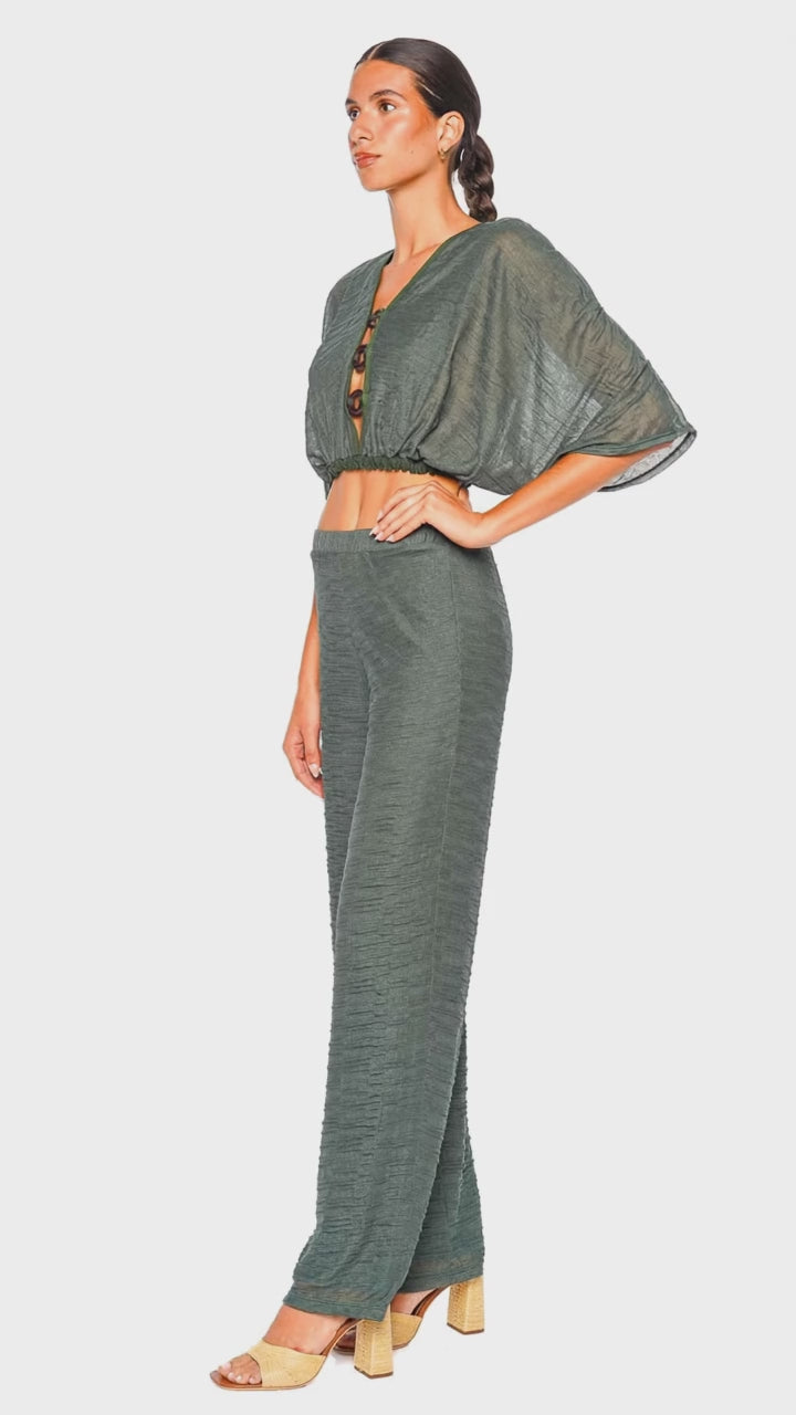 Crafted from a luxurious textured fabric, the Veronika Sacramento Green Wide-Leg Pants offer an effortlessly chic aesthetic. With a high-rise fit and relaxed silhouette, these pants are perfect for sophisticated day-to-night transitions. The timeless green hue and elegant drape make them a versatile addition to any wardrobe. Pair with a tailored blouse and heeled sandals for an upscale ensemble.