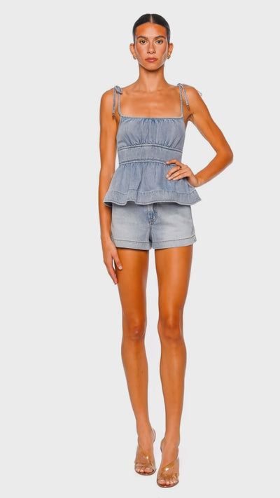 This chic denim peplum top exudes elevated casual style, crafted for the discerning fashionista. Its light blue hue is perfectly complemented by delicate tie straps, offering a custom fit with every wear. Designed with a playful peplum silhouette, it elevates your everyday ensemble effortlessly. Pair it with high-waisted shorts and wedges for a refined summer look.