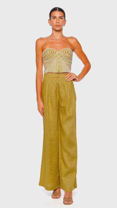 This bold crop top features a striking strapless design embellished with intricate geometric embroidery, offering a visually appealing and modern touch. Crafted from high-quality linen, its vibrant lime hue ensures you stand out with elegance and sophistication. This versatile piece pairs perfectly with high-waisted trousers and sleek stilettos for a refined and stylish ensemble.