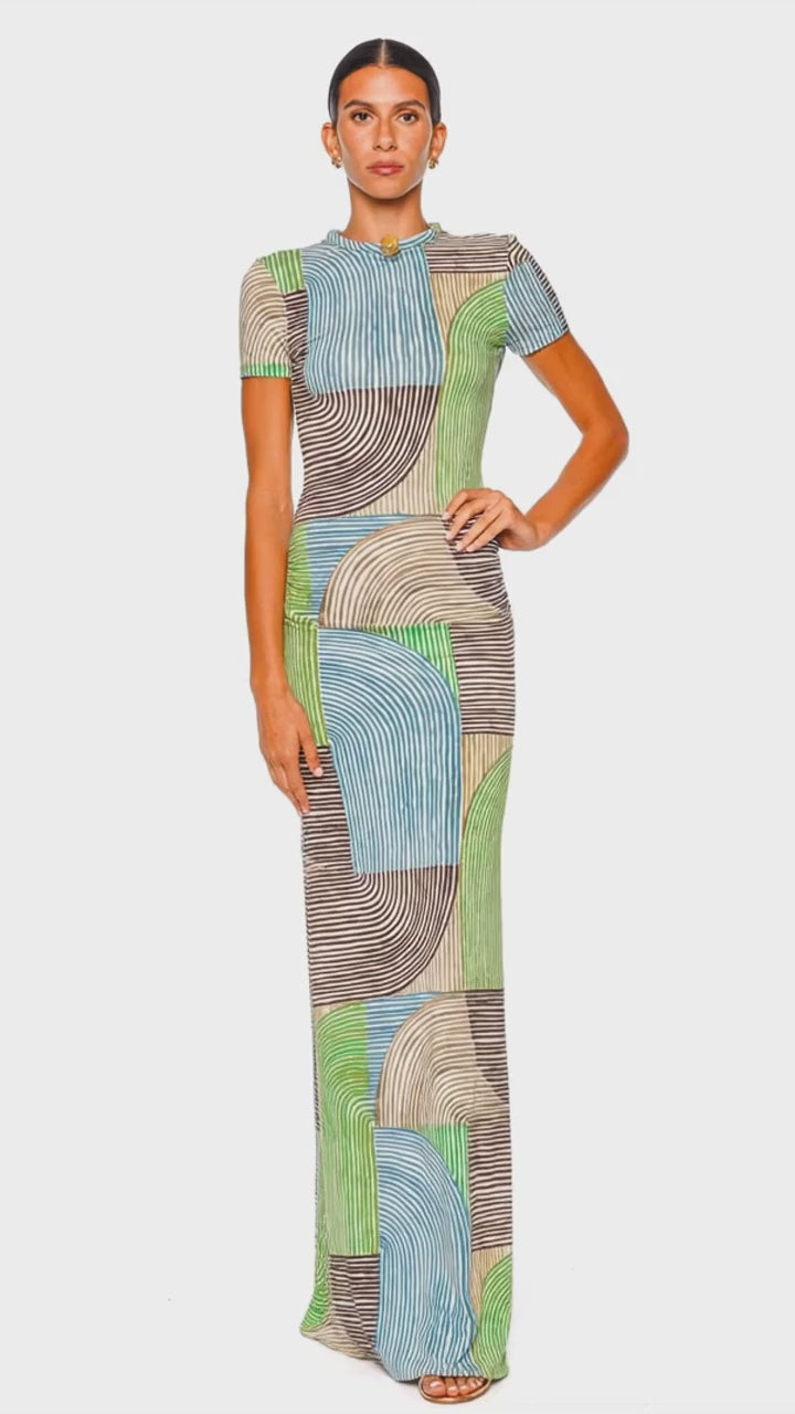 Yara Abstract Green Short Sleeve Maxi Dress