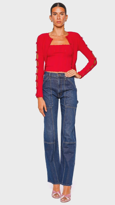 This stunning Zoriah Candy Apple Cardigan exudes elegance with its vibrant hue and intricate detailing. Crafted with precision, the cardigan features playful cutout details on the sleeves, embellished further with fixed bow details. Pair it with high-waisted denim and the matching cropped top for the full, contemporary look.